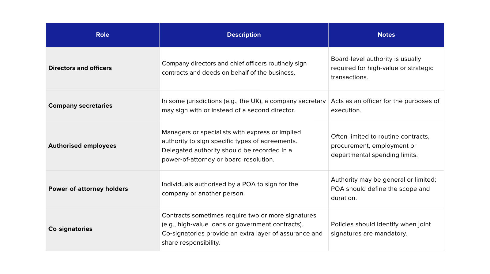 The move towards digital processes and international trade has highlighted the importance of clearly identifying who can sign what. Authorised signatories play a critical role in: